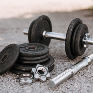 The weight of these dumbbells can be adjusted using steel fasteners and various iron plates. Weight ranges from 0.5kg (empty bar) to 32kg (all plates on one bar). This weight set features:
